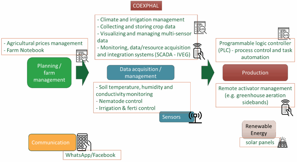 Almeria is a province with important challenges from the point of view of soil and water resource management. Annual precipitation is low at around 220 mm per year. The average temperature on the coast is around 35ºC in summer and 6ºC in winter. It also experiences a high sun exposure of over 3,000 hours per year. The use of technologies to improve the use/management of these resources is key. Consequently, growers must implement a series of changes to the traditional cultivation concept, with the aim of transforming farm activity to more complex systems where renewable energies, automation and digitalization are used to manage different resources, coordinating the flow between the different systems as dictated by the varied nature of the demands and crop requirements (which also fluctuate depending on the time of year and the different varieties used. The main purpose of renewable energies used in this system (experimental farm in the showcase) is photovoltaics and solar thermal. It is for this reason that through this Showcase, Coexphal and the UAL and other showcase stakeholders are working together to identify: