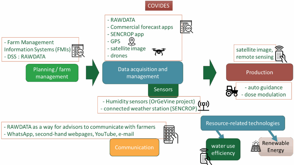 The region of COVIDES faces climate change issue (e.g. water scarcity, drought…), which is an opportunity for digitalisation uptake to maintain agroecological practices in future conditions. Economic issues are amongst the reasons for low uptake of tools, as well as lack of awareness regarding existing tools, and user-friendliness. Another reason expressed for implementing DTs would be to have dedicated tools for their production system (winery), or even for each client. Besides, they would like to dispose of more integrated tools for data collection and registration. To improve the tools’ qualities, they emphasise the role of a good co-construction approach. They are aware of what digital tools can give to them: improve the farmer’s day to day, reduce bureaucracy when they work well, however they are somehow skeptical regarding how they can help specifically regarding agroecological transition. They wonder about a tool to integrate all administrative works for land management and for labor control.
